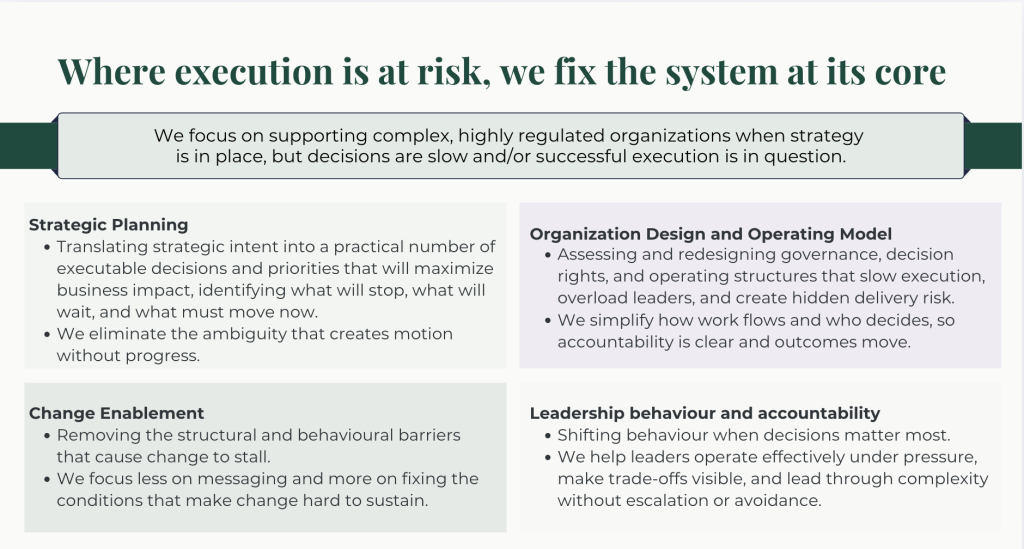 We help complex organisations close the gap between strong intent and real outcomes by fixing the systems that determine how work actually gets done.